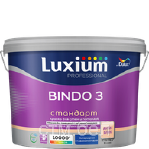 Luxium Bindo 3Глубокоматовая краска для стен и потолковИдеальна для помещений с умеренной нагрузкойОбразует антибликовое покрытиеЛегкое нанесение без брызг и потековМинимальное время сушки между слоями – 1 часОписаниеГлубокоматовая водно-дисперсионная краска для высококачественной отделки стен и потолков в помещениях со стандартной нагрузкой, таких как спальни, гостиные, детские, кабинеты. Антибликовое покрытие отлично маскирует мелкие дефекты поверхности. Тиксотропная: наносится без брызг и потеков, легко разравнивается; с нейтральным запахом.Область примененияДля окраски стен и потолков в помещениях с умеренной влажностью и умеренной эксплуатационной нагрузкой. Наносите на полностью просохшие и гладкие минеральные поверхности (бетон, штукатурка, кирпич и т.п.), гипсокартон, обои под покраску, деревянные поверхности, ДВП. Заявленные свойства краски зависят от выбранного типа обоев.Рекомендована для применения в детских и лечебно- профилактических учреждениях.Особенности примененияПеред применением тщательно перемешайте. Для укреп-ления базовой поверхности, повышения адгезии и уменьшения расхода краски загрунтуйте подготовленную поверхность грунтовкой Dulux. Краску рекомендуется наносить в 2 слоя при температуре воздуха и поверхности +5…+30 °С и влажности воздуха от 40 до 80%.РазбавлениеПри необходимости не более 1 части воды на 10 частей краски.РаспылениеОбычное распыление: разбавить в соотношении не более 1 части воды на 5 частей краски — подходит для большинства оборудования. Безвоздушное распыление: разбавление водой не требуется. При необходимости добавить до 10% воды. Рекомендуемое рабочее давление от 100 до 150 бар, угол распыла факела 30-50°, диаметр сопла 0,012-0,017 дюйма. Дополнительно ознакомьтесь с рекомендациями на сайте производителя окрасочного оборудования.УходЧерез месяц после окрашивания поверхность устойчива к мытью с использованием мягких моющих средств (раствор мыла, геля для душа или мытья посуды, шампуня), возможно небольшое изменение блеска покрытия. Не оставляйте поверхность мокрой после очистки.Технические данныеСвязующее Сополимерная дисперсияРазбавитель ВодаРабочие инструменты Кисть, валик, распылительСухой остаток (масс) ?56%Плотность ?1,49 кг/лБазы BW, BCСистема колеровки AcomixВремя до нанесения следующего слоя 1 часВремя полного высыхания покрытия 2-4 часаРасход на один слой До 14 м?/лУход за окрашенной поверхностью Через месяц после окрашивания поверхность устойчива к мытью с использованием мягких моющих средств (раствор мыла, геля для душа или мытья посуды, шампуня), возможно небольшое изменение блеска покрытия. Не оставляйте поверхность мокрой после очистки.Срок и условия хранения 4 года при температуре от +5 °С до +30 °С в невскрытой заводской упаковке